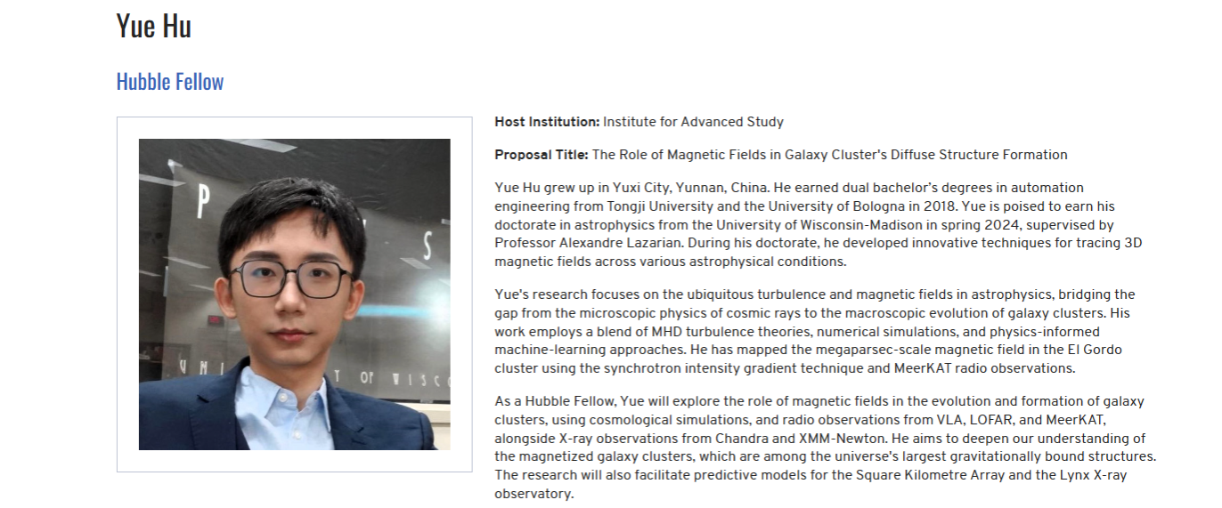 NHFP是美国天文学界最负盛名的博士后荣誉,获奖者可在美国自由选择合作单位从事博士后研究,由美国宇航局提供全额工资和研究经费。作为一名哈勃学者,胡越将前往普林斯顿高等研究院和加州理工学院开展关于“磁场在星系团形成中的作用”的研究。(获奖者介绍详见:https://www.stsci.edu/stsci-research/fellowships/nasa-hubble-fellowship-program/2024-nhfp-fellows)