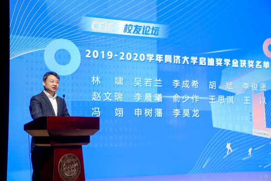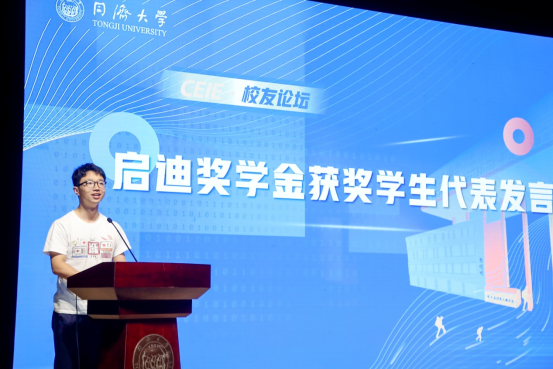 获奖学生代表2017级自动化专业本科生李成希发言,他首先表达了对吴启迪教授的敬仰与感谢,并谈到自己对启迪奖学金背后精神的理解,最后号召全体同济学子秉持创新精神,提高实践能力,同舟共济,自强不息,将论文写在祖国大地上。