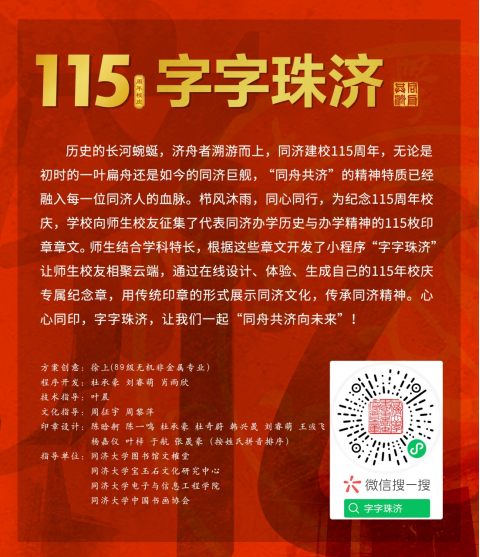 师生校友心怀对母校的感谢、感恩和期盼,这份深厚情感成为他们研发“字字珠济”小程序的初衷,这是对母校115岁生日的最好献礼。希望师生校友相聚云端,亲自体验在线设计生成同济印,加上名字做成校庆章,通过印信文化领略115岁同济的精神和文化。在属于同济人的节日里,祝福学校,祝愿所有同济人,心心相印,字字珠济,一起“同舟共济向未来”!(文中部分内容摘自于44118太阳成城集团图书馆微信公众号)