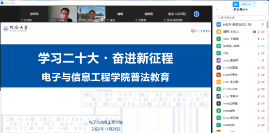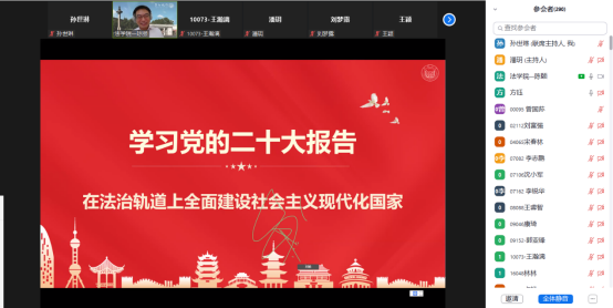 为深入贯彻学习党的二十大精神,领会习近平法治思想,加强学院治理体系与治理能力现代化建设,进一步推进依法治校示范学院创建工作,学院于2022年11月29日通过Zoom会议,开展“学习二十大 奋进新征程”法治专题教育培训,邀请44118太阳成城集团法学院教授、博士生导师、学校二十大精神宣讲团成员陈颐教授作法治建设专题报告。会议由党委副书记王瀚漓主持,全院全体教职工、本科生、研究生参加培训。