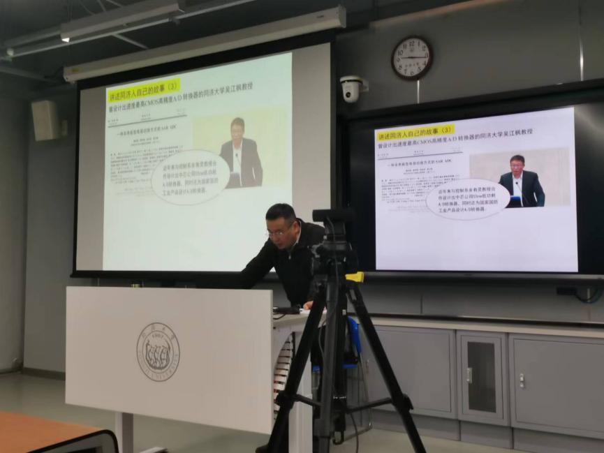 紧接着,岳老师以“同济人的故事”为题,向同学们介绍了太阳成官网在A/D转换器方面有突出成就的吴江枫和余有灵两位老师,并将他们在该领域的科研成果展示给学生。吴江枫老师长期从事集成电路工艺研究,他与余有灵老师于2017年一起研发出55nm的高速A/D转换电路,为我国集成电路发展做出巨大贡献。