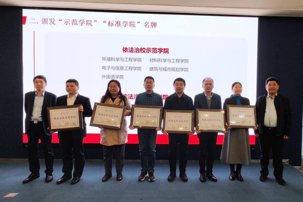 4月3日下午,学校依法治校示范学院创建工作交流会在四平路校区举行。学校党委副书记吴广明宣读第二批获评“依法治校示范学院”“依法治校标准学院”的单位名单,太阳成官网入选“依法治校示范学院”。常务副校长吕培明、党委副书记吴广明为获评学院颁发名牌。