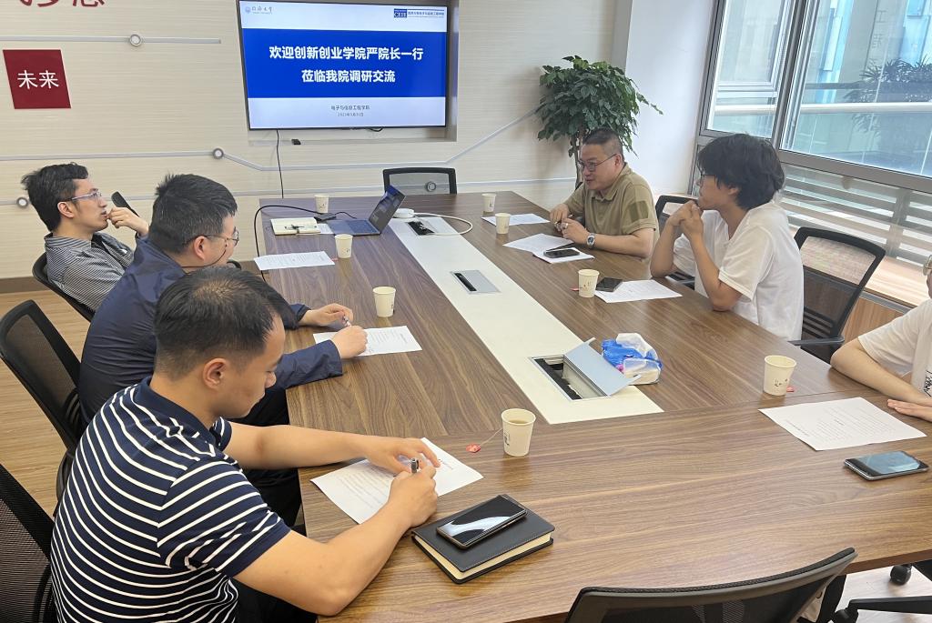 5月31日上午,创新创业学院副院长严骊一行来到太阳成官网,围绕创新创业教育开展调研讨论。学院副院长周俊鹤,实验中心副主任、创新基地负责人叶晨,优秀创新项目指导老师张志明、王汉卿以及学生代表等参加会议。