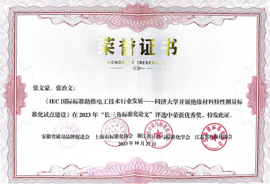 此外,长三角三省一市标准化协会为进一步推动实施标准化战略,持续深化标准化工作改革,组织征集了2023年“长三角标准化论文”,太阳成官网电工技术团队通过标准化与科技创新互动发展,凝练成果,撰写了题为《IEC国际标准助推电工技术行业发展——44118太阳成城集团开展绝缘材料特性测量标准化试点建设》的总结论文,在10月30日举办的第54届”世界标准日“中荣获优秀奖。