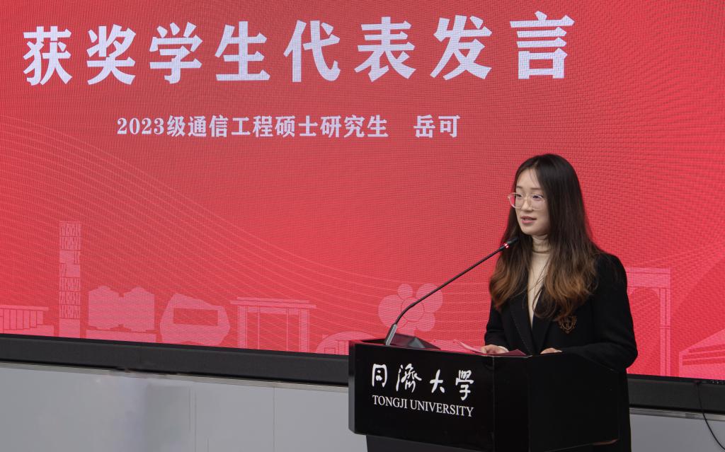 获奖学生代表2023级通信工程专业硕士研究生岳可发言。她首先代表所有获奖同学向吴启迪教授、各位校友致以崇高的敬意和衷心的感谢。她表示,荣获启迪奖学金是对学生积极投身于创新实践的认可,更是对学生矢志科学、追求真理的鞭策。她呼吁青年学子积极弘扬启迪奖学金的精神,在实践中应用并内化理论知识,在解决实际问题中提升创新能力,将自身发展与国家发展紧密结合,践行同济人的使命担当。