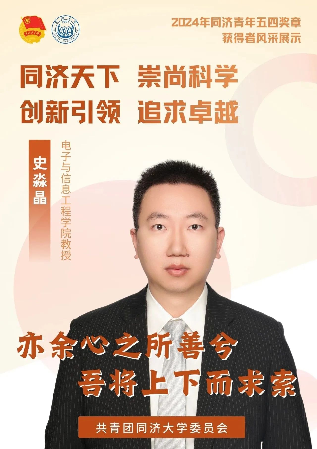 希望广大青年再接再厉,积极践行“同济天下、崇尚科学、创新引领、追求卓越”的新时代同济文化,从榜样先进事迹中获得启发,胸怀远大理想、勇立时代潮头、锤炼精神品格,不负伟大时代、不负青春韶华,书写充实精彩、绚丽夺目的篇章!