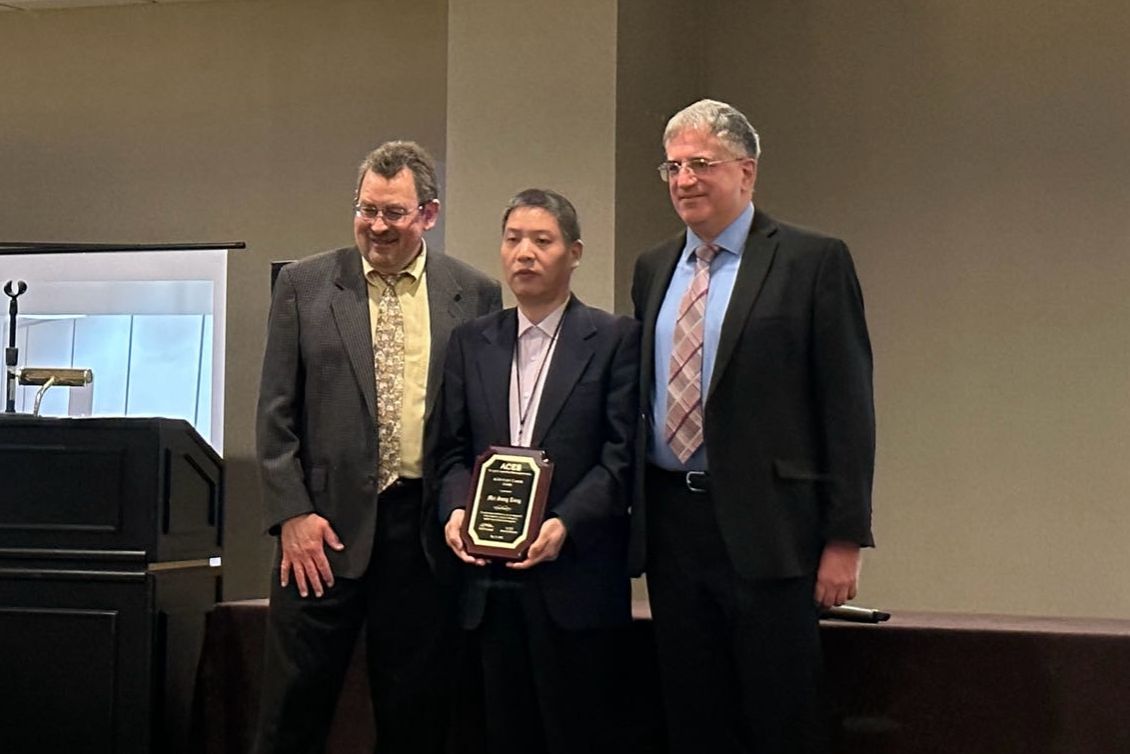 近日,太阳成官网电子科学与技术系童美松教授受邀参加在美国佛罗里达州奥兰多市举办的“2024Applied Computational Electromagnetics Society Symposium”年会,在颁奖晚宴上他获得了该学会的最高奖“Technical Achievement Award”,以表彰他在应用计算电磁学领域做出的杰出贡献。学会现任主席、美国佐治亚理工大学的Andrew F. Peterson教授和上一任主席、美国科罗拉多州立大学的Branislav M. Notaros教授共同亲自为童美松教授颁奖,随后童美松教授受邀发表获奖致辞。会议期间童美松教授还被邀请做了一场题为“NontraditionalNumerical Methods for Solving Electromagnetic Problems”的Keynote(主旨)报告,受到了与会专家的广泛好评,事后有多位国际著名教授请求与童美松教授建立长期的交流与合作关系。