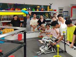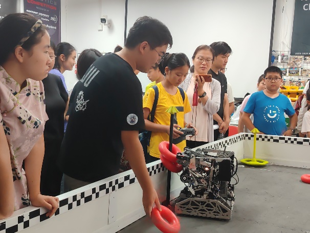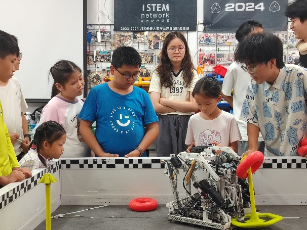 上午,孩子们走进华楼VEX机器人实验室,在志愿者带领下零距离接触各类机器人。志愿者们首先介绍了VEX赛事的基本内容,以及机器人的结构、运行原理及其比赛任务;随后,志愿者演示了人工操控和自动巡航两种模式,小朋友们也纷纷上阵实操体验,现场不时传出惊叹与欢笑。