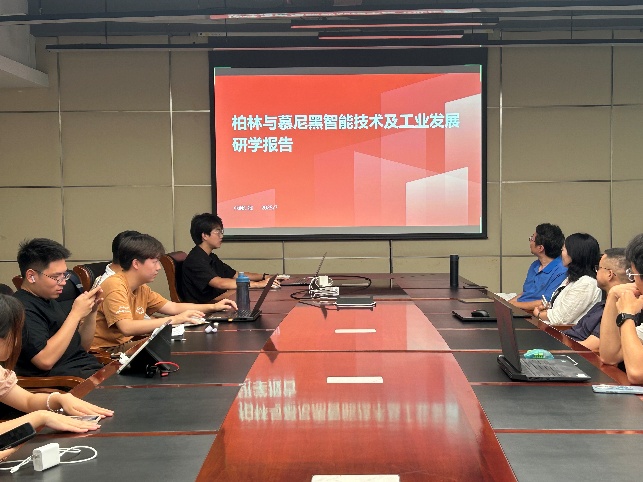 在慕尼黑工业大学Alois Knoll教授领衔的机器人、人工智能和实时系统研究所,研学团深入考察了该所的前沿研究成果。研究所成员姚相同博士、Nenad Petrovic博士后及刘明宇博士展示了实验室代表性设备,介绍了“面向汽车软件与系统开发的AI智能体”,并分享了“路端数字孪生”相关项目。