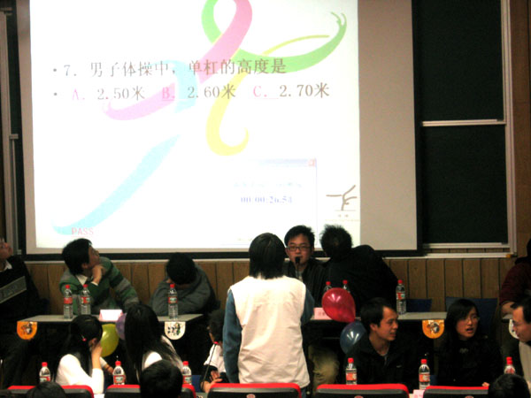 开幕式结束后,随即进行了一场精彩的“春聚嘉园,E启奥运”奥运知识竞赛。竞赛紧扣全民奥运的时代主题,意在让全体师生在知识竞赛中体验奥运精神;参赛队突出奥运五环的主题,将学院的五个系的同学组成五个队参加角逐。经过小组必答、时速冲击、风险加速、决战PK等四轮紧张激烈的比赛,最终,控制理论与控制工程系获得团体冠军、电子工程与技术系获得团体亚军。