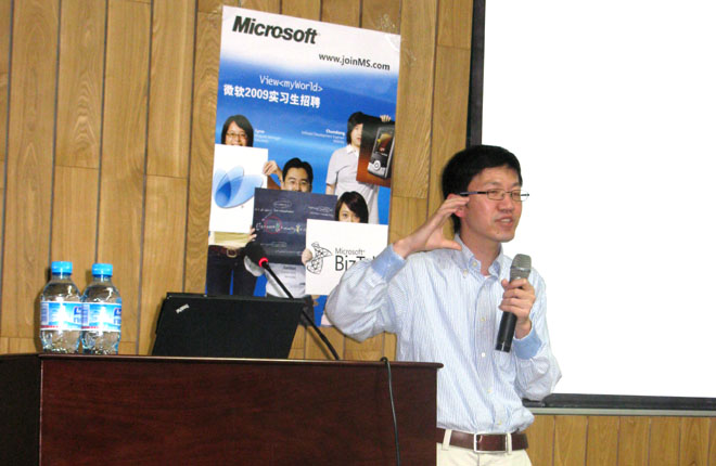 活动中,张俊波先生给同学们带来了一场题为Building cloud scale 24x7 transaction platform using ASP.NET and SQL Server的精彩讲座。张俊波先生用生动的语言,简要介绍了云计算的基本理念,还以自己的亲身经历,从用户体验、访问方式、维护方式、安全、性能、可靠性、数据管理等7个方面剖析了在线服务和桌面程序的区别,以及微软在线服务平台的现状和优势。