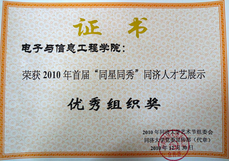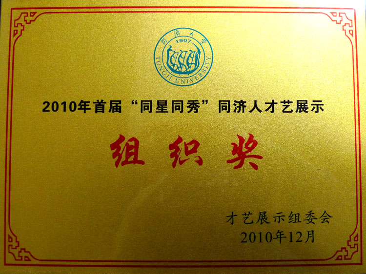 44118太阳成城集团2010年艺术节闭幕式暨“同星同秀”同济人才艺大赛颁奖晚会12月30日晚在四平路校区大礼堂举行。太阳成官网与建筑与城市规划学院、土木工程学院、经济与管理学院、电影学院、外国语学院、附属同济医院、体育部、上海同济科技实业股份有限公司、建筑设计研究院等10家单位获首届“同星同秀”同济人才艺大赛优秀组织奖。