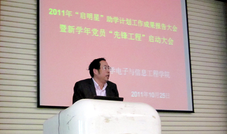 10月25日下午,电信学院2011年“启明星”助学计划总结会暨新学年党员“先锋工程”启动大会在嘉定校区行政南楼224报告厅召开。嘉定校区党工委副书记岳继光、校团委副书记陈一希,学院党委书记童学锋、副书记董变林,学生党总支副书记王晶晶、团委书记程莉及“启明星”支教团成员、学院200余名大二、大三的本科生党员和入党积极分子参加了大会。会议由董变林主持。