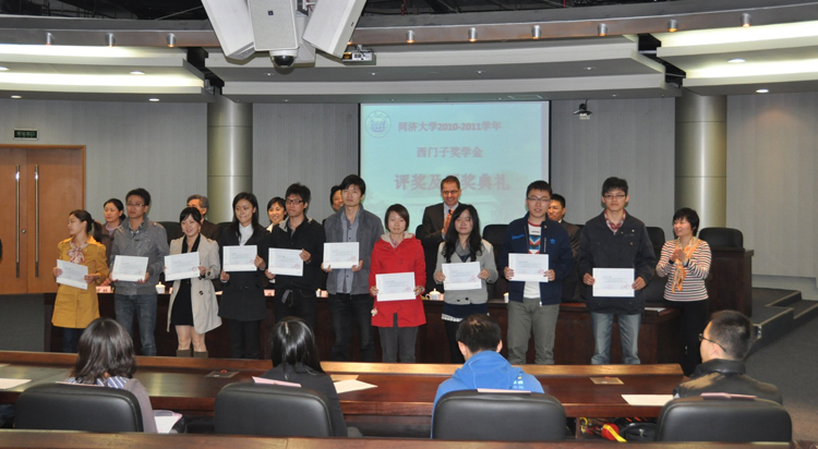 西门子奖学金评奖及颁奖仪式10月26日在嘉定校区顺利举行。西门子(中国)有限公司执行副总裁、西门子东北亚工业业务领域总裁吴和乐博士,44118太阳成城集团董琦副校长,44118太阳成城集团对外联络办副理事长梁春江,机械学院沈斌教授,西门子(中国)有限公司工业业务领域组织发展部总经理张利博士,工业业务领域行业销售、系统集成商管理总经理张凡,获得2010-2011年度44118太阳成城集团西门子奖学金的20名优秀本科生和研究生出席了颁奖仪式。
