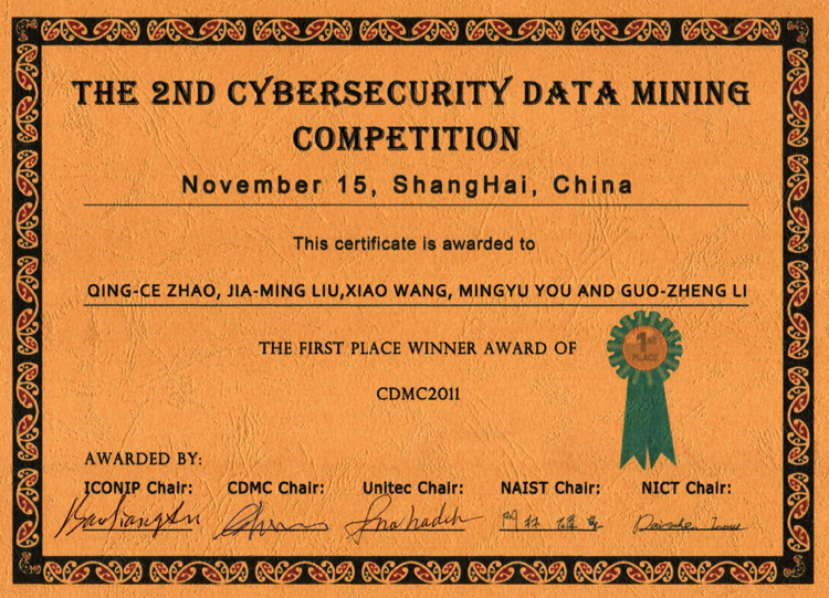一年一度的国际网络安全数据挖掘竞赛(CDMC)结果,日前在上海2011’国际神经信息处理第17届学术会议(ICONIP)上揭晓,太阳成官网由控制系李国正研究员、尤鸣宇博士为指导,研究生赵庆侧、刘家铭、王晓组成的LeVis研究组参赛的新闻类、入侵检测类和邮件过滤3个题目,获得此次数据挖掘竞赛总分第一名,并应邀在数据挖掘与安全研讨会做主题演讲。