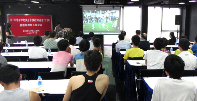 副院长苗夺谦在会上首先致辞,感谢学校对学院科技创新工作的支持,感谢各位指导教师的辛勤指导和同学们的积极努力;创新基地联络人刘永焕,从科技创新氛围营造、学生主体培养和创新能力提高等方面向会议作了年度工作汇报;ACM队员、启迪奖学金获得者、09级计算机科学与技术专业俞丁胜同学也汇报了自己的科技创新经历和心得体会。