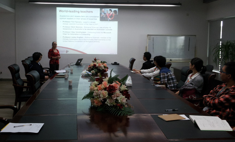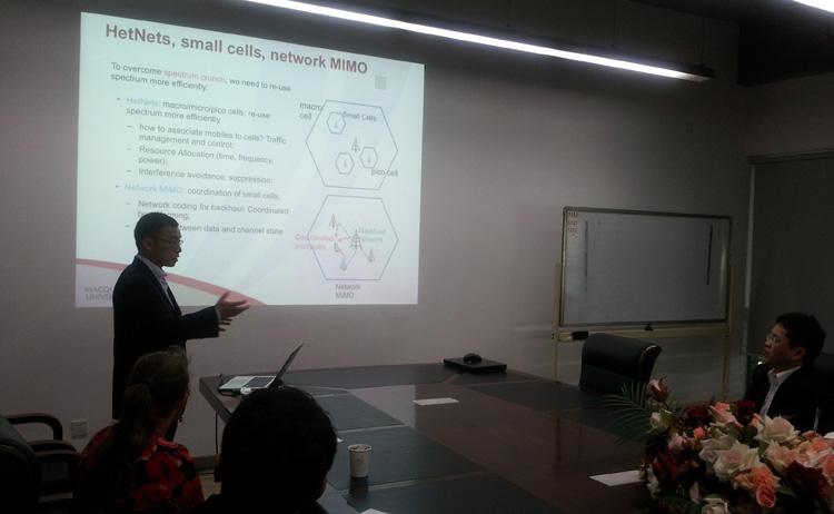 Kelsie Dadd院长首先向师生们介绍了麦考瑞大学的概况、师资、院系设置、办学特色、学科设置、产业合作伙伴、创新科研、奖学金、学生就业等情况,以及联合培养博士生项目;接着,方更法博士向师生们介绍了麦考瑞大学工程学院主要开展的关于下一代无线通信网的研究,如电子电路与装置、电磁及天线技术、HetNet中的Small Cell技术等,并介绍了在由多用户MIMO网络构建的主网中设置一个认知无线电网络以有效重用频谱的实例。双方就无线通信技术领域中感兴趣的话题进行了探讨。随后,尹学锋副教授向对方介绍了44118太阳成城集团以及电信学院科研、国际合作交流情况。最后,双方均表达了希望开展合作的意向,并就合作形式及需要进一步探讨的问题充分交换了意见。