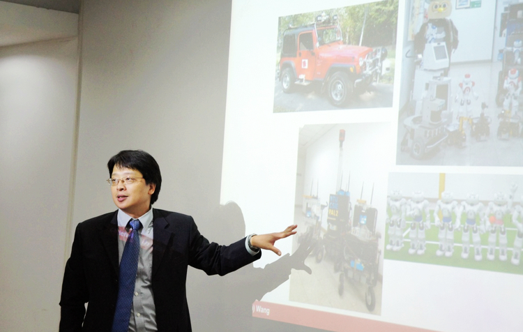下午的报告会由刘富强教授主持。王�智副教授的报告主题是“Machine Perception for Driving”,介绍了如何融合激光雷达与摄像头的信息,建立地图模型,实现机器人无人操控的目的,同时还介绍了无人驾驶相关技术。