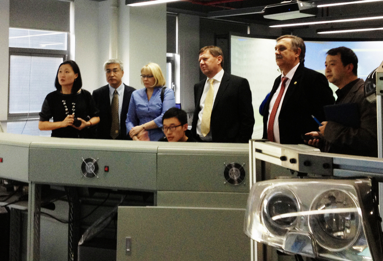 双方在会谈中介绍了各自学校的情况,并从教学、科研合作、学生交流及双学位项目建设等方面进行了深入探讨。弗拉基米尔・瓦西里耶夫校长一行还饶有兴致地参观了虚拟现实技术工程平台、嵌入式视频监控平台及脑认知与智能系统试验平台,并和平台研究人员进行了交流,表示双方可在相关领域做更深入的交流。