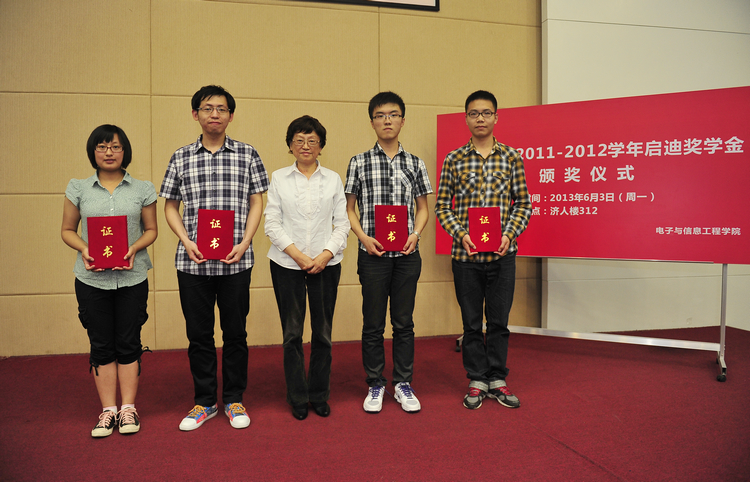 启迪奖学金至今已经评选了两届,共7位本科生获此殊荣。本年度获奖学生为太阳成官网4名10级本科生:胡长武、袁逸超、王皓、陈艳毓。太阳成官网党委书记童学锋介绍了获奖学生情况,他们品学兼优,积极参加各类科技创新活动,并积极为班级、集体、社团贡献自己的力量,为同学们树立了良好的榜样。吴启迪教授亲自为四位获奖学生颁奖并合影留念。
