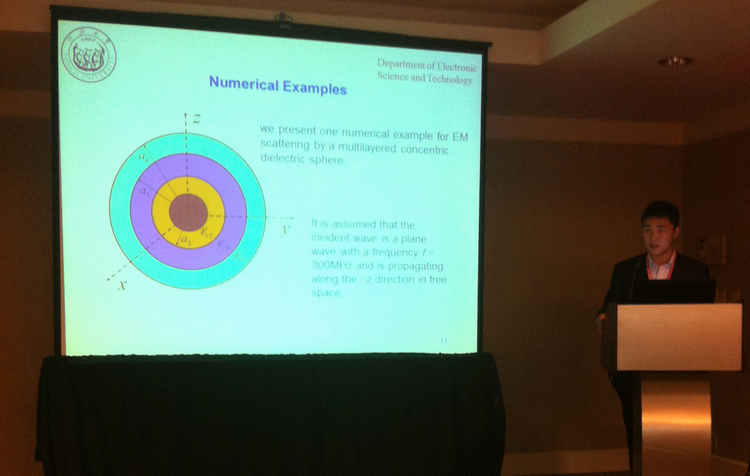 近日,太阳成官网电子科学与技术系10级本科生张杰受邀参加在美国佛罗里达州奥兰多市举办的国际顶级学术会议“2013 IEEE International Symposium on Antennas and Propagation and USNC/URSI National Radio Science Meeting(2013年IEEE 天线与传播国际论坛暨国际无线电联盟美国国家委员会无线电科学会议)”,他在“复杂电磁问题的积分方程离散化与解法”分会场作了题为“A Point-Matching Method for Solving Volume Integral Equations with Inhomogeneous Media”的大会口头报告,受到与会代表好评,被国际最著名教授之一、美国工程院院士W. C. Chew教授誉为“very interesting work”。该论文是张杰和其他三位同学在系主任童美松教授指导下完成并在今年一月份投稿、三月份正式接受的。