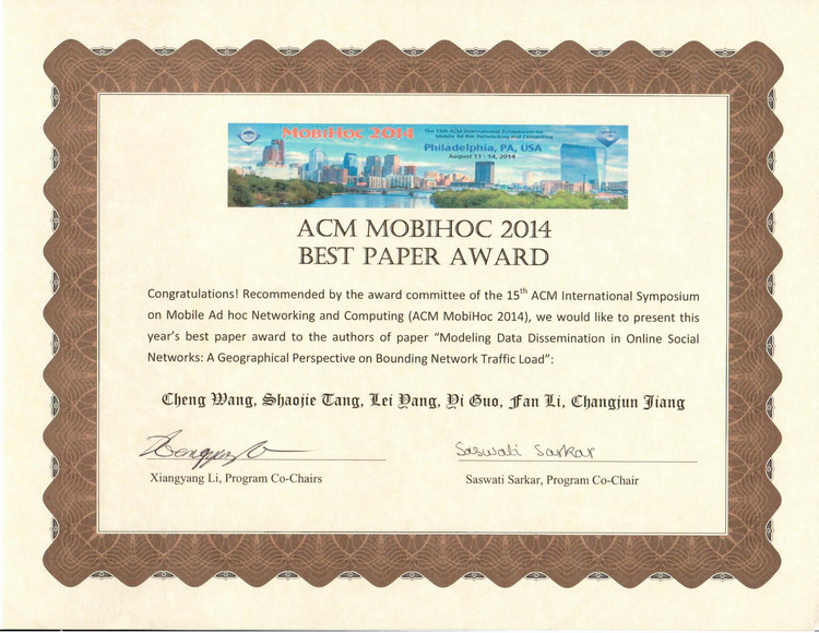 ACM MobiHoc是美国计算机协会(ACM,Association for Computing Machinery)主办的移动计算领域重要的专业学术会议。此次大会是第十五届,吸引了211篇有效投稿论文,会议录用率为18.9%。会议组委会从接收论文中挑选4篇作为最佳论文奖的候选者,经过激烈的角逐,最终王成研究员等完成的论文被选为唯一最佳论文。