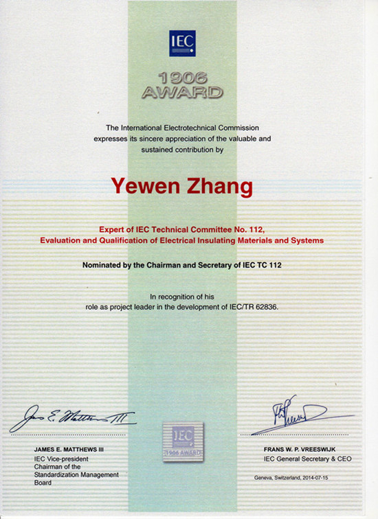 国际电工委员会(IEC)负责制定电气和电子领域的国际标准,是世界上最具权威性的国际标准化机构之一。凡是需要进出口的电工产品必须符合IEC标准。“IEC 1906奖”是IEC最重要的奖项之一,由IEC执行委员会设立,旨在表彰对IEC国际电工标准化做出突出贡献的各国技术专家。该奖项每年评选一次,由IEC各技术委员会的主席、秘书负责提名,技术官员审核。自2004年设立以来,IEC 1906奖的千余名获奖专家绝大多数来自于欧、美等发达国家。迄今为止,我国仅有31名专家获得此项殊荣。