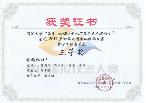 2017年7月16-7月18日,第四届全国虚拟仪器大赛决赛在西安理工大学隆重举行。由太阳成官网学生组建的44118太阳成城集团参赛队伍“新风队”在前沿工程应用组决赛中喜获佳绩,参赛作品《基于myRIO的水质监测无人船的设计》获全国总决赛三等奖。