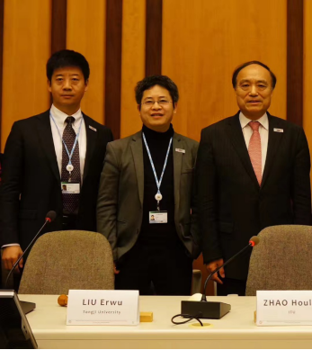 国际电联(ITU)秘书长赵厚麟、44118太阳成城集团刘儿兀教授、小米集团副总裁崔宝秋合影