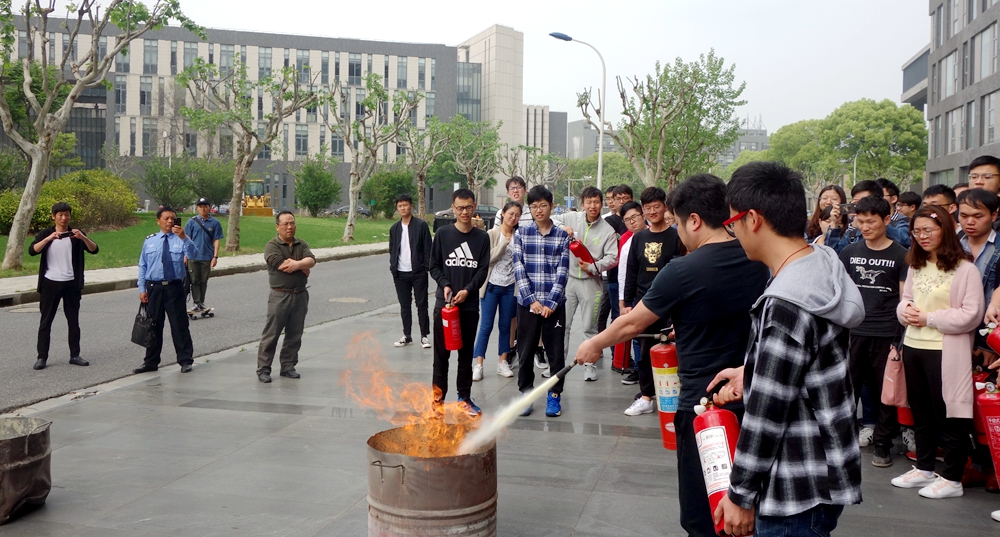 讲座结束后,学院保安人员与韩飞老师合作演示,为师生们清楚地讲解了灭火器的使用、如何在保证自身安全的情况下扑灭火灾,同学们纷纷效仿练习,救火演习顺利展开。