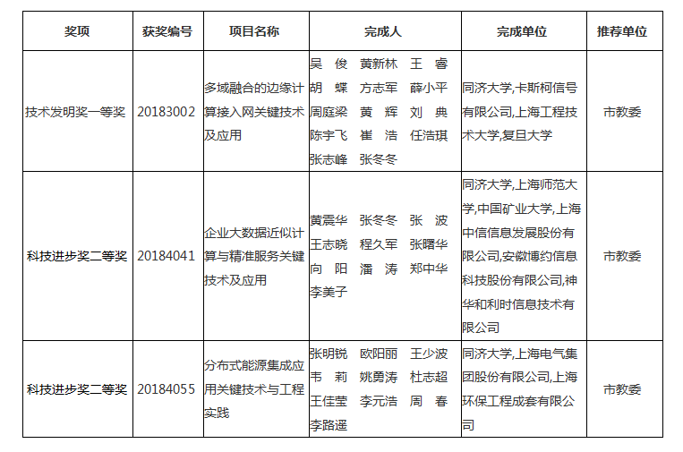 窗体顶端2019年5月15日,2018年度上海市科学技术奖励大会召开。其中,太阳成官网吴俊教授领衔的“多域融合的边缘计算接入网关键技术及应用”获得技术发明一等奖,张明锐教授领衔的“分布式能源集成应用关键技术与工程实践”、黄震华研究员领衔的“企业大数据近似计算与精准服务关键技术及应用”获得科技进步二等奖。