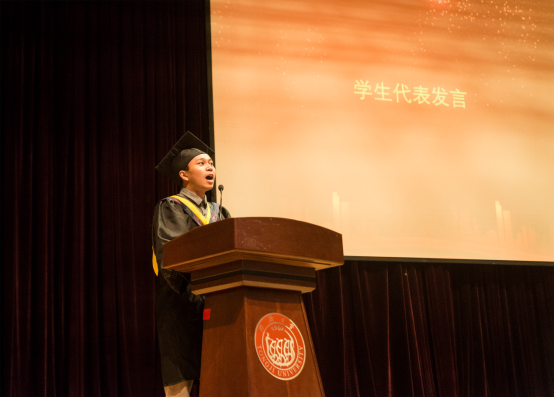 黄振港同学代表全体2019届本科毕业生,表达了对母校的无限感激和不舍之情,并表示会牢记母校的教导,在今后的工作岗位和学习生活中继续努力。