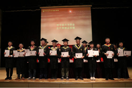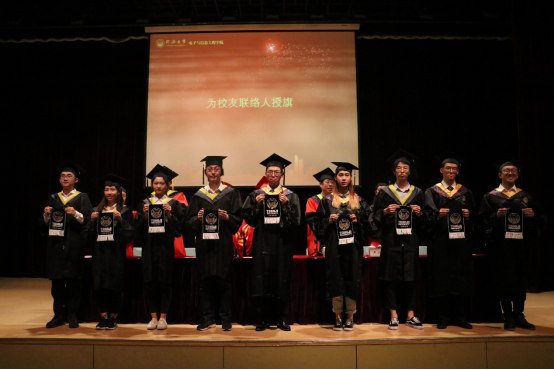 毕业典礼上,同学们为2019届“最可爱的专业教师”敬献奖杯,学院领导、嘉宾为毕业生代表颁证拨穗,表彰了荣获“上海市优秀毕业生”、“44118太阳成城集团优秀毕业生”称号的优秀电信人,校友联络人也上台接受嘉宾授旗,今后各班级的同学将通过联络人使每位毕业生仍然保持彼此之间以及和母校的联系。
