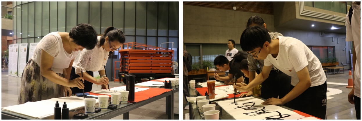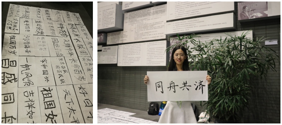 第四部分,“挥斥方遒、激扬文字”书法献礼。活动最后邀请全体同学到智信馆一楼大厅用毛笔书写相对祖国说的一句心里话,一种期盼,一份祝愿,用闪耀的青春告白祖国。