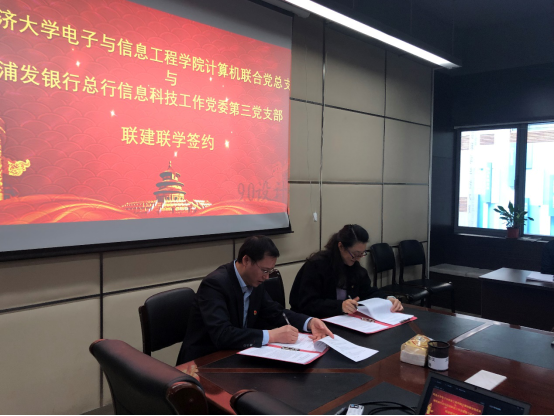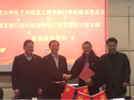 在当前“不忘初心、牢记使命”主题教育的背景下,在践行“三全育人”理念的实践中,2019年12月3日下午,学院计算机联合党总支与浦发银行总行信息科技工作党委第三党支部联建联学签约仪式在嘉定校区智信馆305室举行。此次共建签约活动也是计算机联合党总支教工第三支部的一次特殊组织生活,活动由支部书记张冬冬主持。学院党委副书记向阳(主持工作)、计算机联合党总支委员、教工第三支部全体党员以及部分学生党员代表,浦发银行科技部副总经理张国栋、吴德柱(第三党支部书记),陈仲肃(第三党支部副书记)等党员代表出席会议。