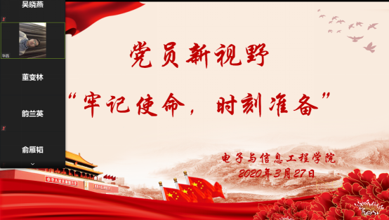 2020年3月27日,电气信通联合党总支举办了“把初心落在行动上、把使命担在肩膀上”主题党日活动。此次主题党日活动搭借学院“党员新视野”平台,邀请了赴武汉抗击新冠肺炎疫情归来的最美“逆行者”华晶医生,给师生党员做“牢记使命,时刻准备”的线上讲座。学院党委副书记董变林、电气信通联合党总支书记金立军以及电气信通联合党总支所有教工和学生党员、部分退休党员参加了此次活动。