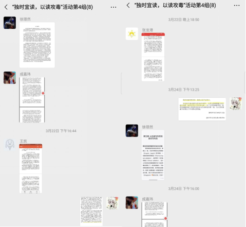 在党员同学的组织和带领下,“独时宜读,以读攻毒”读书活动第四小组的同学们在微信群内分享阅读进度和心得体会,查找与疫情和新药的故事相关的材料,分享自己的感悟与收获。