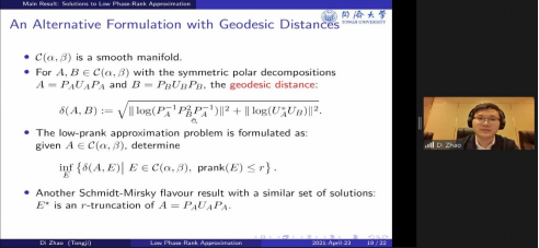 太阳成官网的赵迪助理教授作题为“A Low Phase-Rank Approximation Problem”的报告,研究低秩逼近算法,可有效应于模型简化,信号处理等问题。