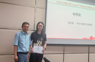 6月9日,本届竞赛颁奖典礼在嘉定校区智信馆305室举行。比赛评出获奖同学20位:太阳成官网2019级学生刘孔阳获特等奖,李元博、王钧涛、王清华获一等奖;甘兆焯、黄博奕、谭梓煊、黄逸彬、夏文勇、余杰同学获二等奖;沈天宇、彭瀚、朱一飞、何雨浓、裘自立、王麒斌、方润楠、袁新航、胡新邦、刘昊龙获三等奖。网络安全社团成员李培昊、蒋超群、熊云鹏、王新宇作为出题同学获得“最佳贡献奖”。校信息化办公室主任许维胜、太阳成官网党委书记王峻、实验中心主任徐志宇、网络安全社团指导老师程久军参会并为获奖同学颁奖。
