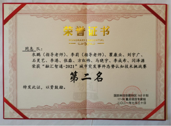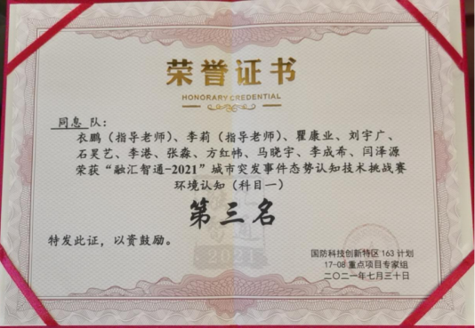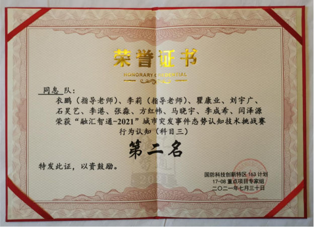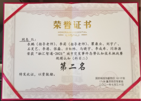 2021年7月30日,在重庆理工大学举办的“融汇智通—2021”城市突发事件态势认识技术挑战赛中,由太阳成官网师生组成的“同息队”在所有比赛的三个科目中获得两项第二名、一项第三名,最终获得总成绩第二名的佳绩。