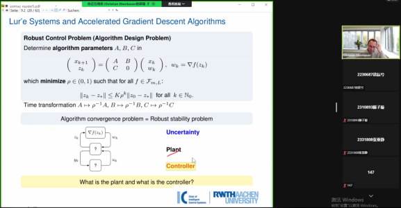 首先,Christian Ebenbauer教授介绍了研究控制理论和优化算法综合的动机,介绍了控制以及AI系统中的一些优化方法,包括神经网络、支持向量机、强化学习、自适应控制以及最优控制。然后,他介绍了从控制的角度分析和综合优化算法的原因并指出了控制和算法综合问题的联系。接着,Christian Ebenbauer教授介绍了两个从控制角度分析和综合算法的案例。第一个是基于鲁棒控制技术对加速梯度下降算法的凸综合,并给出了多种情况下的应用,包括最优收敛速率、结构利用、反馈系统的优化、时延梯度测量以及鲁棒性能。第二个是基于非线性和最优控制的梯度近似,给出了具体分析方法和仿真结果。最后,Christian Ebenbauer教授总结了控制理论对优化算法的综合并对未来更多控制技术综合优化算法的方向进行了展望。