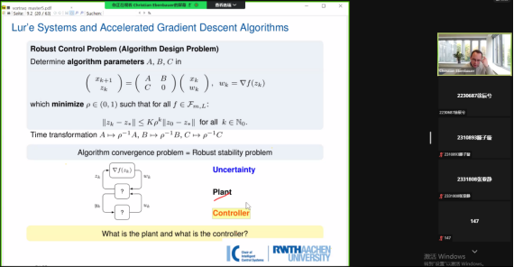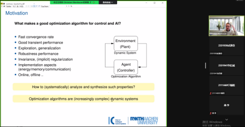 报告结束后,Christian Ebenbauer教授就优化算法综合相关的问题与老师和同学们进行了交流。Christian Ebenbauer教授也根据自身经历勉励同学们要积极拓宽视野,努力探索、发现并解决新的科学问题。此次报告进一步拓展了我校师生的视野,增强了对控制理论综合优化算法的认识与理解。(文/图 张皓  王云姣)