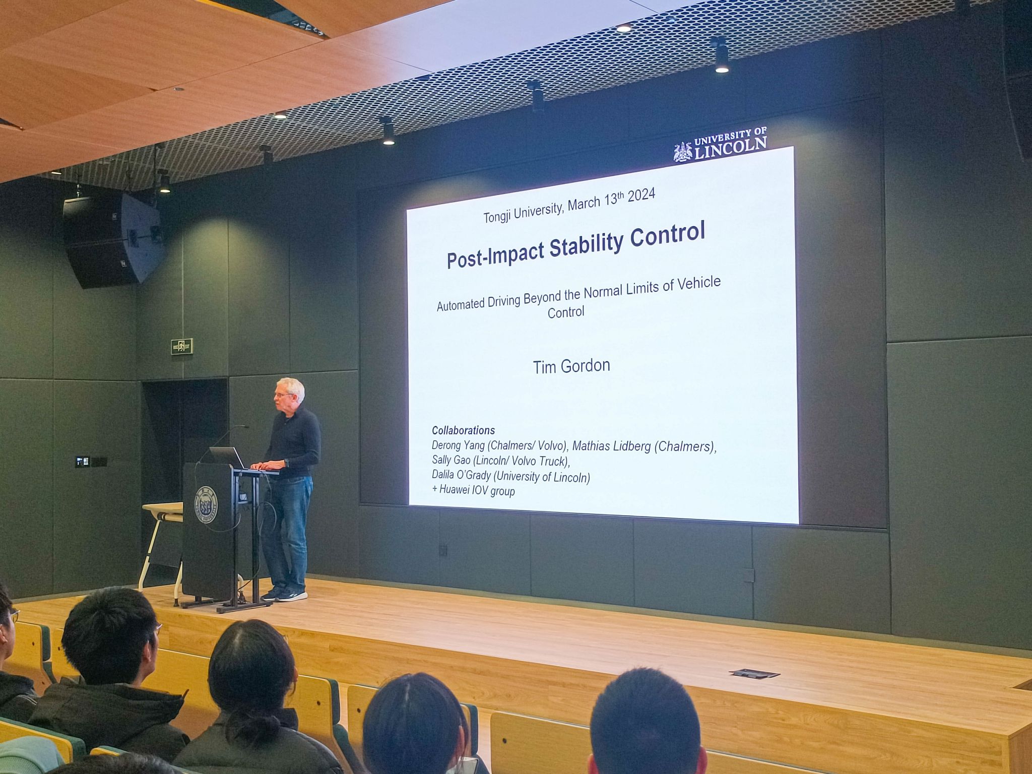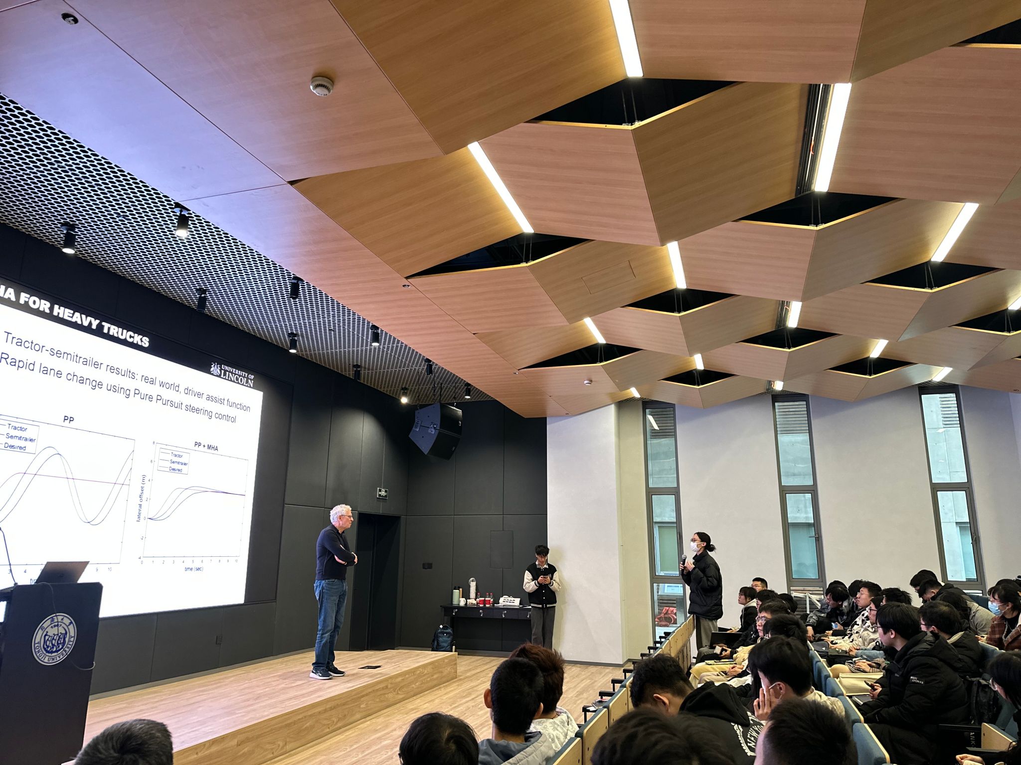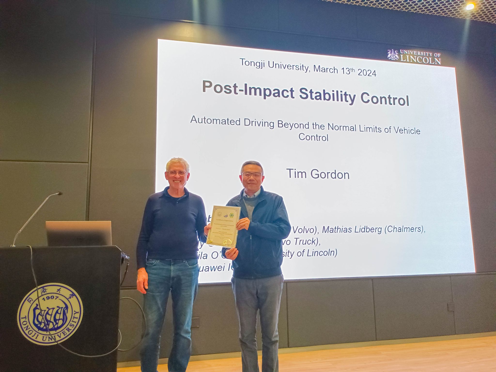 2024年3月13日下午,由学院、上海自主智能无人系统科学中心联合举办的智·信讲堂第64期在太阳成官网智信馆117报告厅开讲。本次讲堂邀请英国林肯大学Timothy Gordon教授作“Post-Impact Stability Control-automated driving beyond the normal limits of vehicle control”主题报告,由陈虹教授主持。