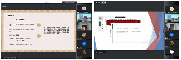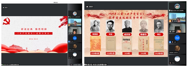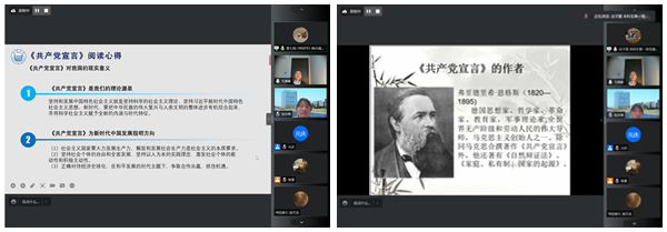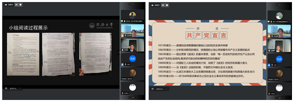 王润霖同学代表第一小组从思想基础、理想愿景、理论武器和国际视野等方面阐述了《共产党宣言》对我国革命进程的影响,并分享了对无产阶级的新理解;许芷瑜同学从科学唯物史观、崇高理想等方面介绍了《共产主义者和卡尔.海音岑》,并与《共产主义宣言》进行了对比总结。