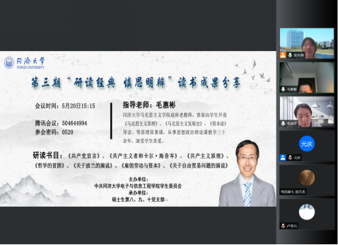 在疫情防控的特殊时期,5月20日下午,学院学生党委举办党员新视野暨第三期“研读经典 慎思明辨”假期读书线上分享会。本次分享会由学生党委副书记刘永焕老师主持,马克思主义学院退休思政专家毛惠彬老师现场点评,学生党员、入党积极分子100余人参加了分享会。