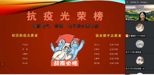 4月30日,学院2021级电气、信通、电子联合博士班召开了线上班会。学院党委组织员吴晓燕老师、联合博士班班主任蔚瑞华老师及班级全体博士生参加了本次班会。