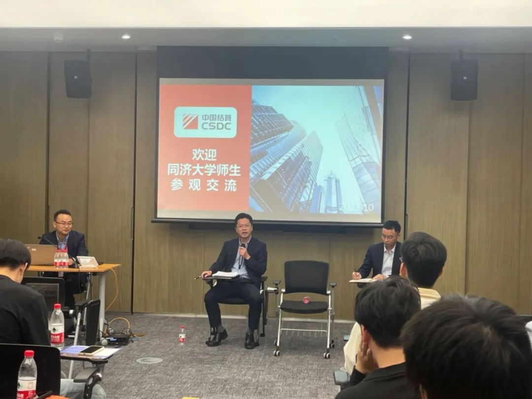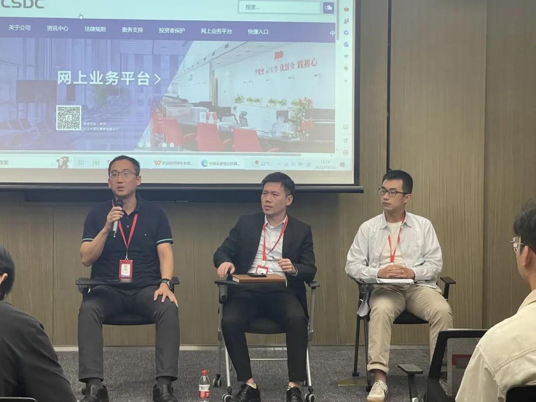 展区参观结束后,同学们来到会议室参与座谈交流会,聆听技术部门领导的分享。三位技术部门的领导向同学们深入介绍了公司的组织架构、员工的职业发展以及公司获得的多项荣誉。他们指出,中国结算是中国证券市场重要的基础设施,承担证券交易集中登记、托管与结算服务等重要职能。