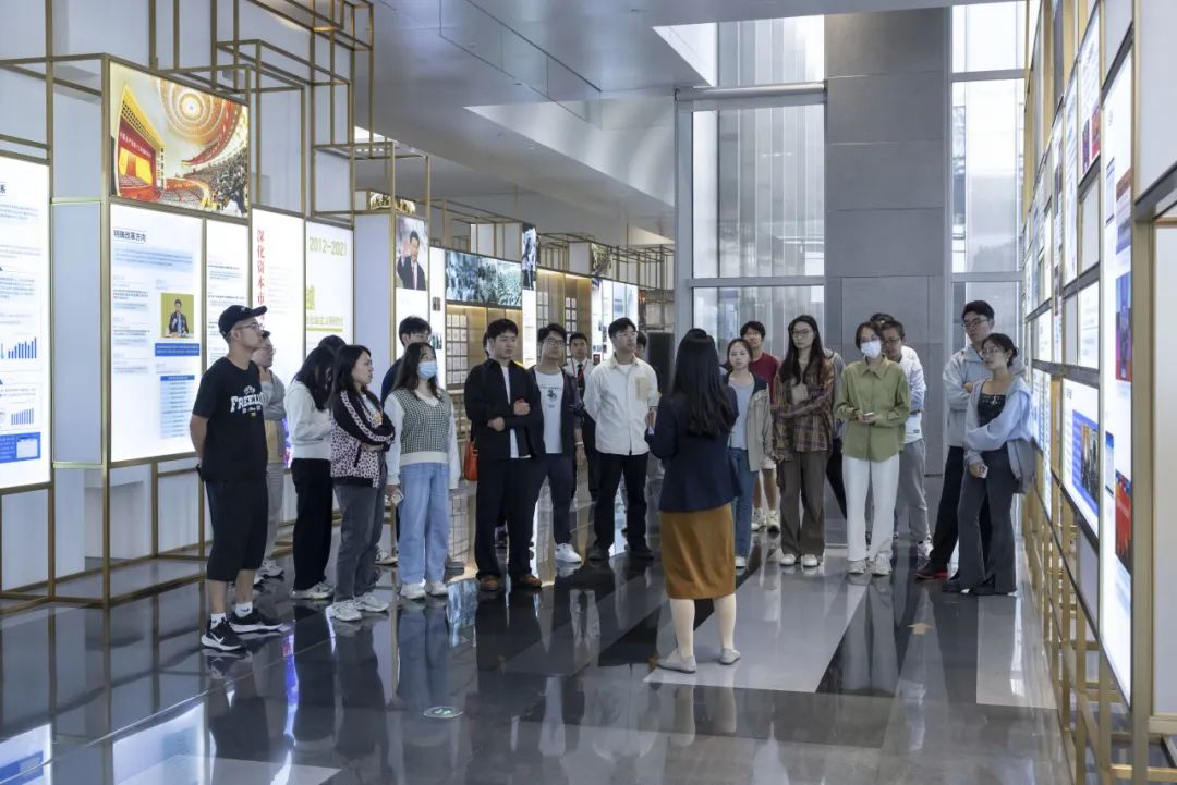 在人事经理的细心讲解下,同学们参观了中国证券博物馆上海金融交易广场特展。该展区跨越了中国共产党百年历史的四个关键时期,通过“开端、探索、发展、跨越”这四个模块介绍了新中国证券市场的诞生和成长。通过参观展区,同学们认识到中国证券市场的发展历史是一部充满挑战与机遇的故事,反映了中国经济的崛起和现代化的进程。