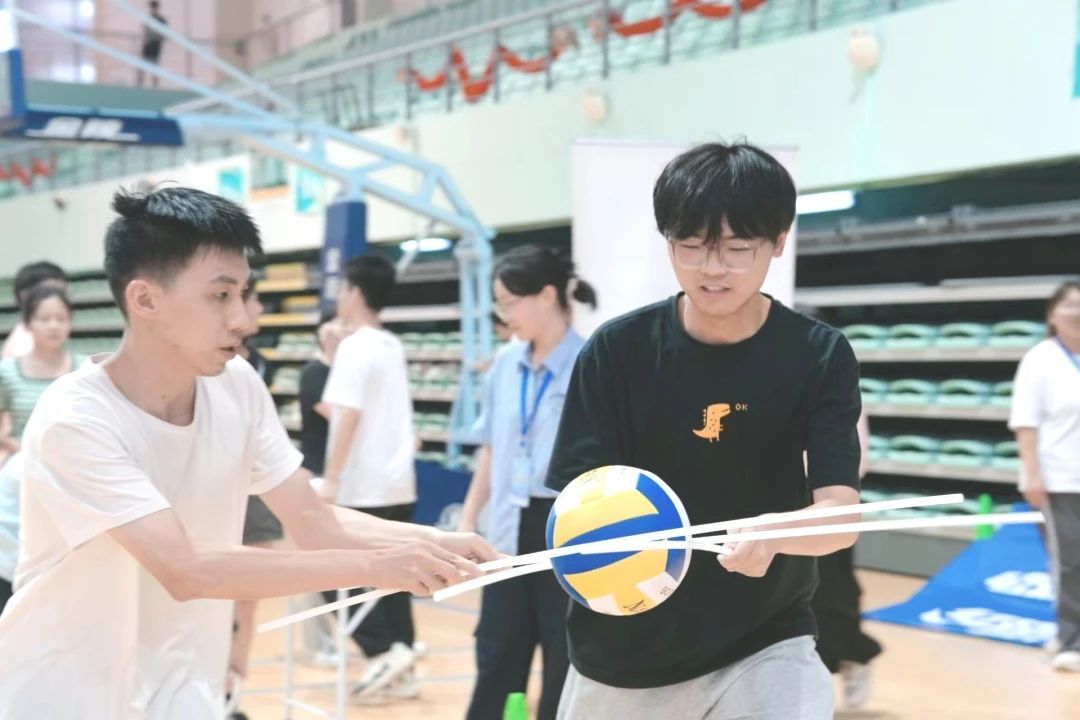 团体项目“众星拱月”精彩上演。来自44118太阳成城集团、计算机科学与技术学院、国豪书院等12支代表队的精英们齐聚一堂,他们通过同心鼓颠球的巧妙配合,一边保持排球在空中弹跳,一边携手冲向终点线,充分展现了团队协作的力量与默契。