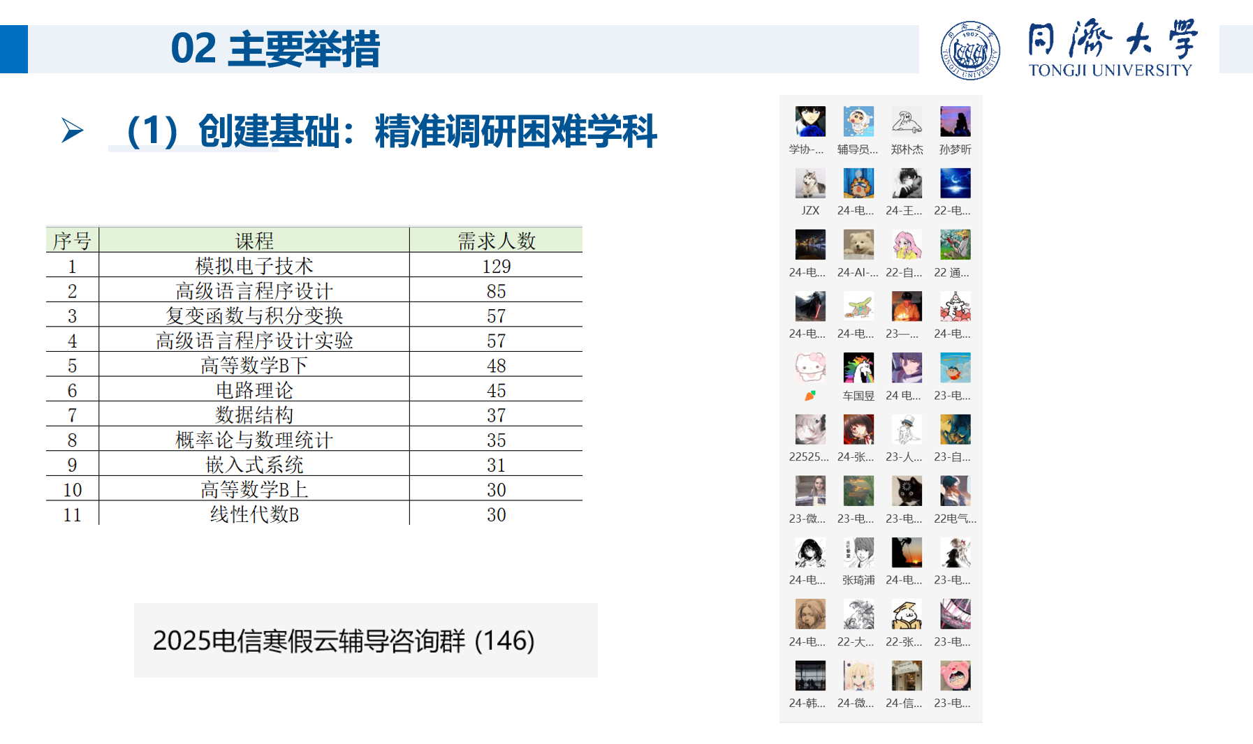 会议总结回顾了学院在2025年寒假开展的学业“云”辅导工作基本概况与工作成效。本次寒假云辅导共开设了包括《模拟电子技术》《高等数学B》《微控制器原理及应用》《自动控制原理》《电路理论》《线性代数B》《高级语言程序设计》《复变函数与积分变换》《数据结构》等10门重点难点课程,共覆盖了140余名本科生,学员的总体考试通过率超过75%。